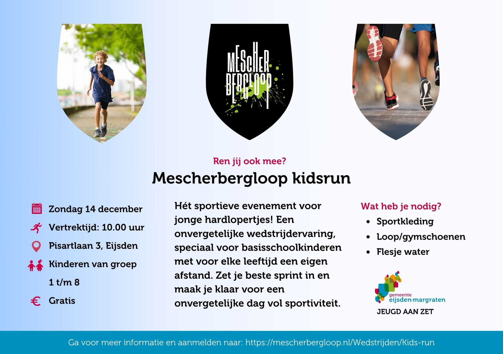 De Mescherbergloop Kidsrun is hét sportieve evenement voor jonge hardlopertjes! Een onvergetelijke wedstrijdervaring, speciaal voor basisschoolkinderen met voor elke leeftijd een eigen afstand. Zet je beste sprint in en maak je klaar voor een onvergetelijke dag vol sportiviteit.